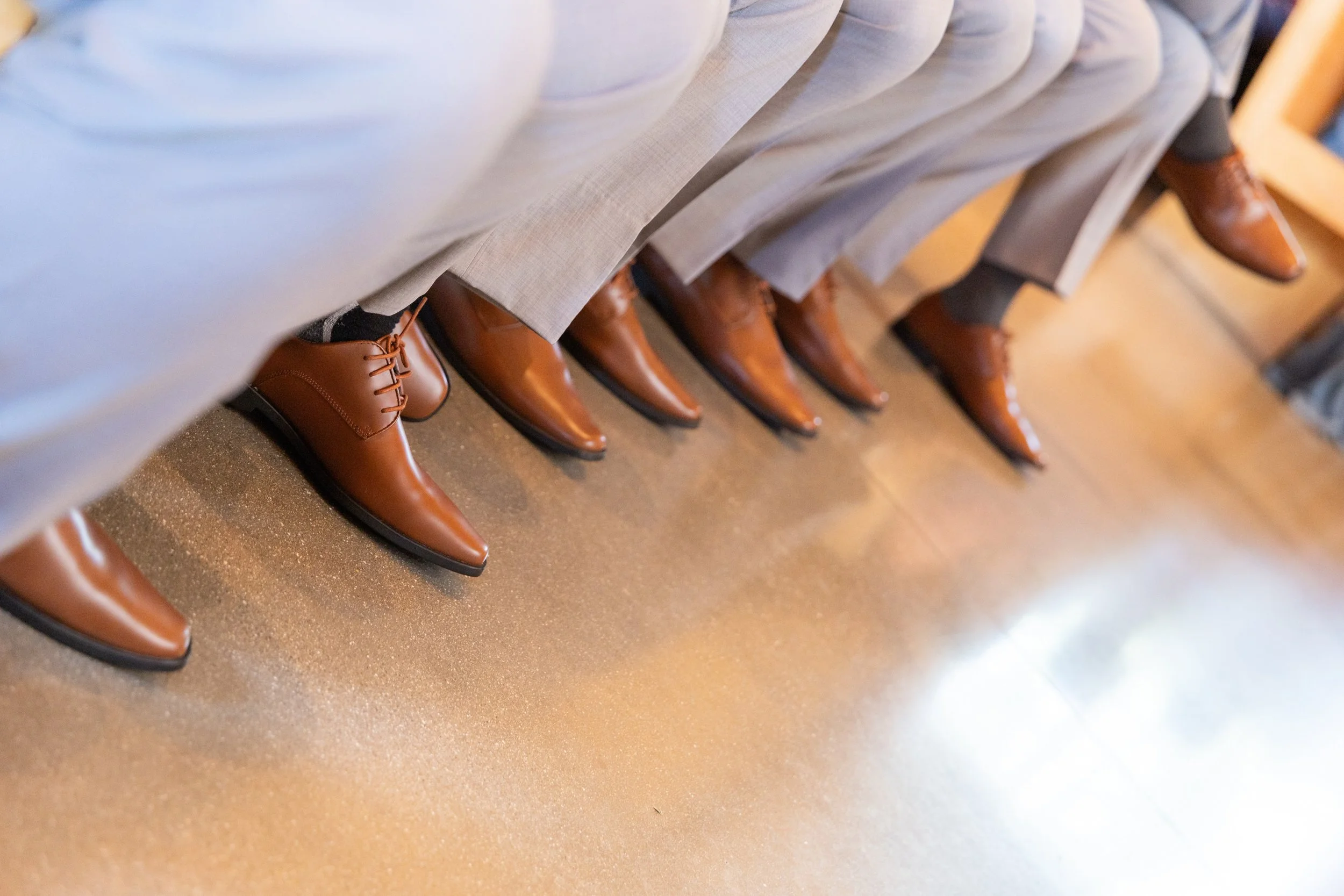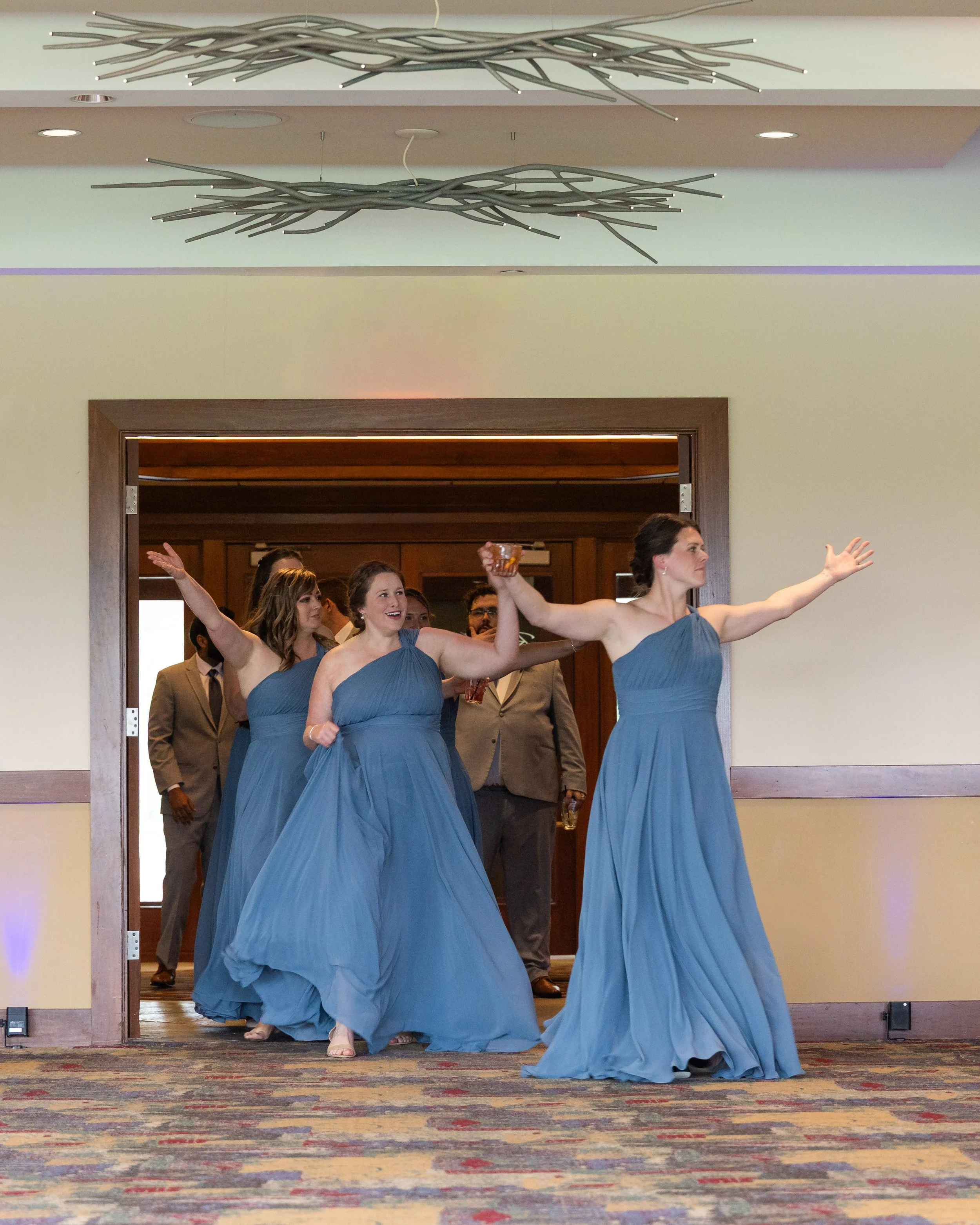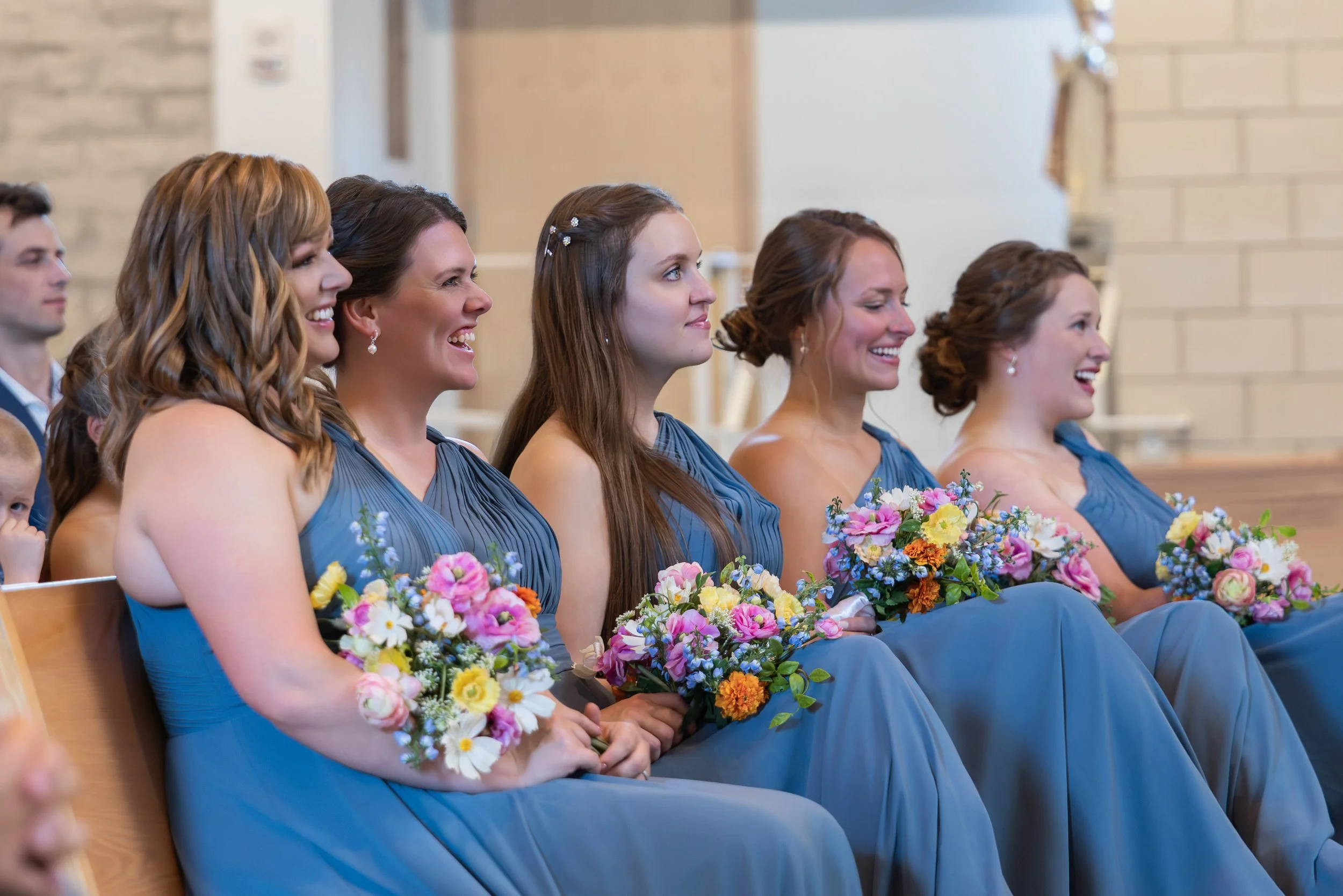 Dusty blue bridesmaids stood in contrast to the warm interior tones, adding a soft summer palette without overwhelming the space.