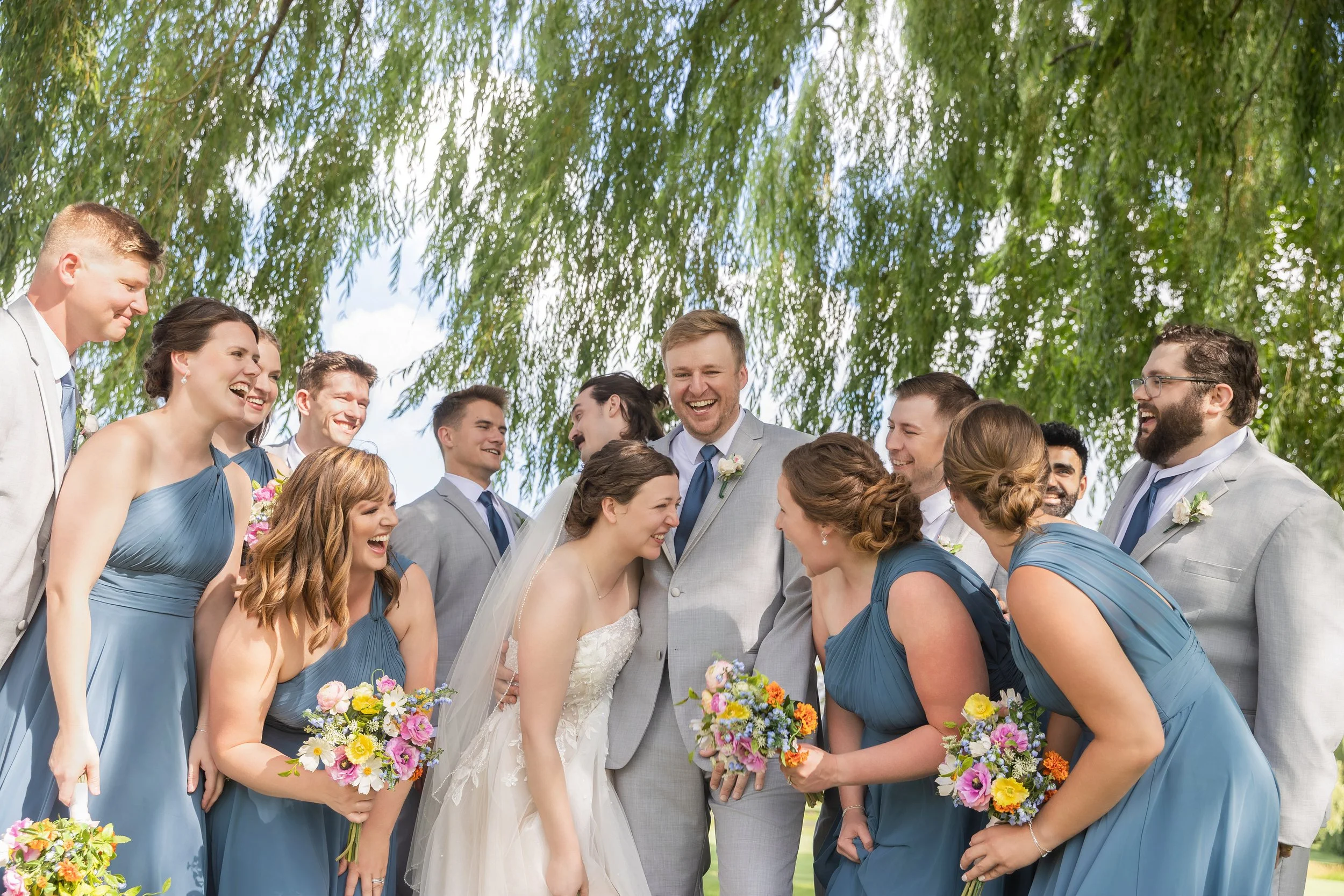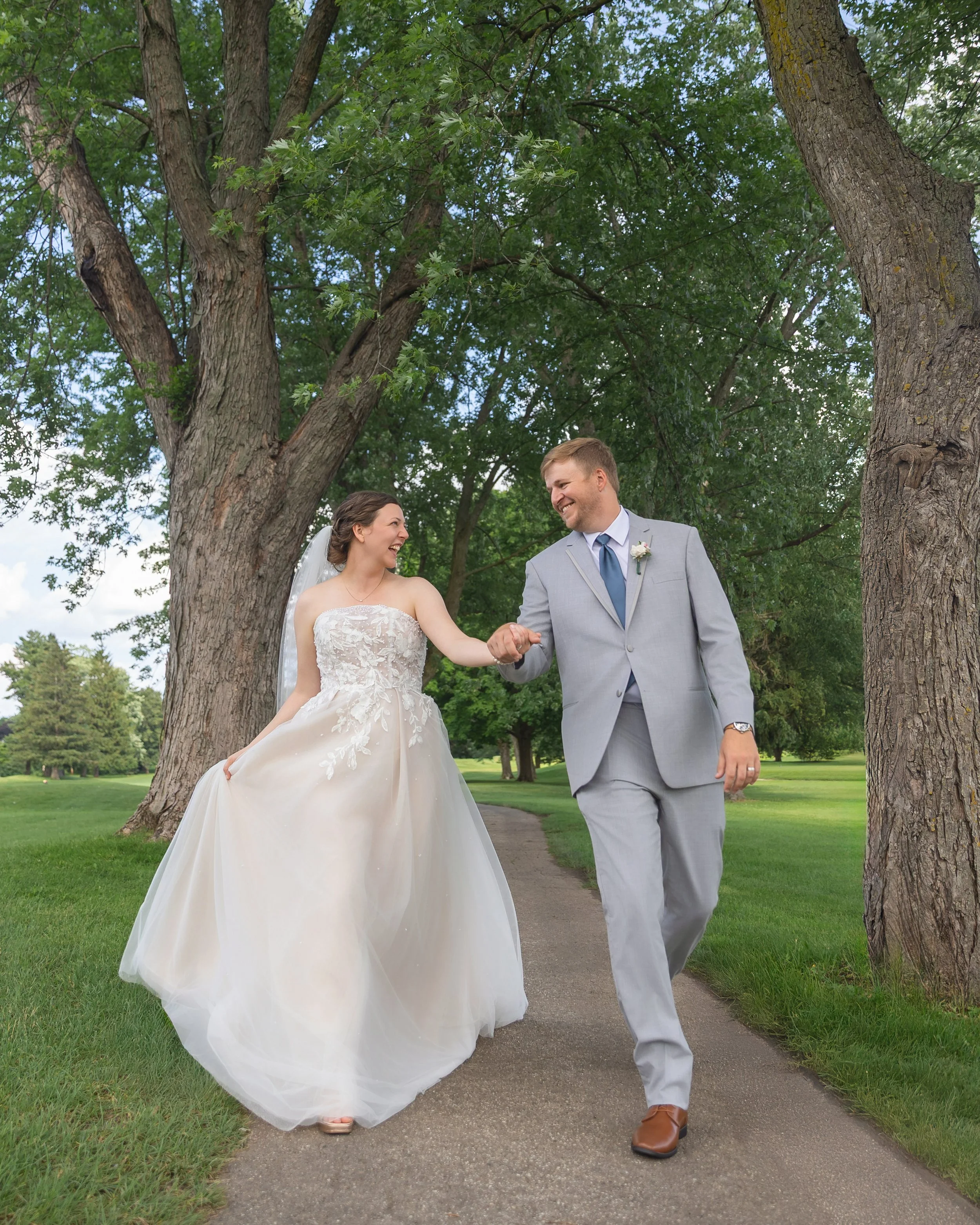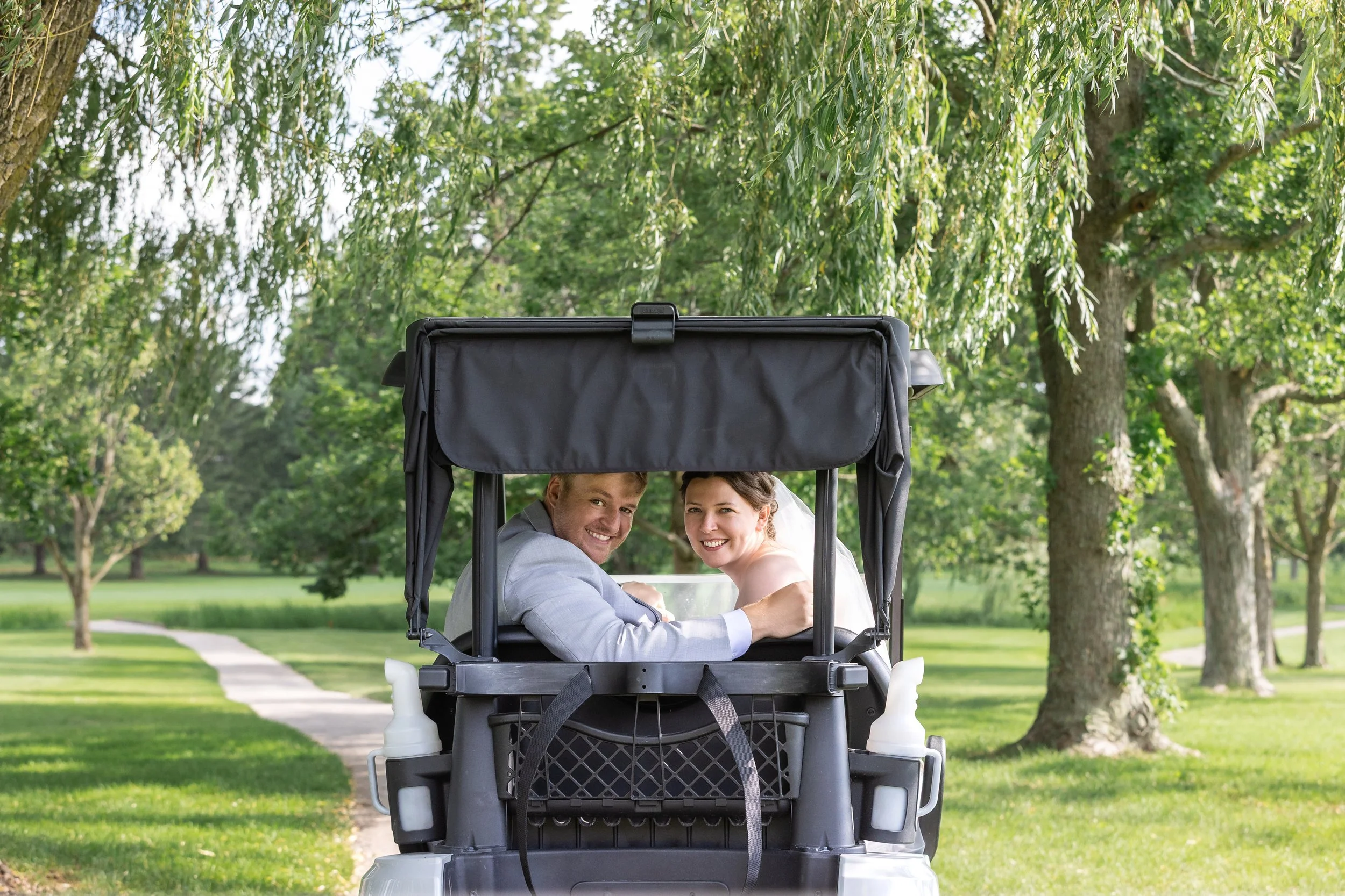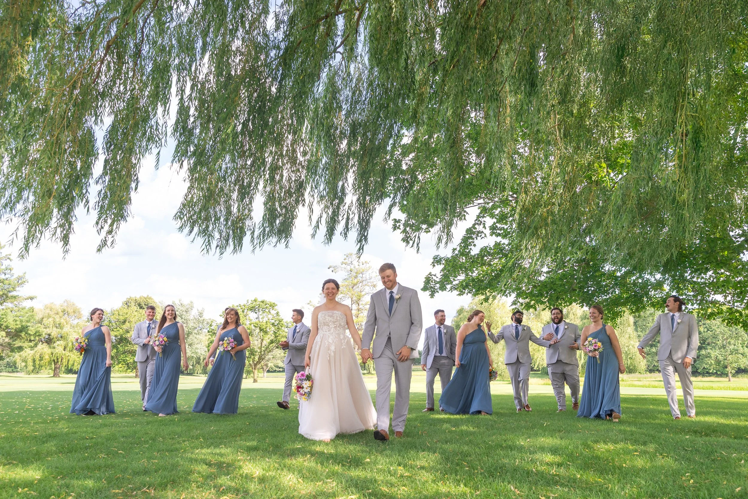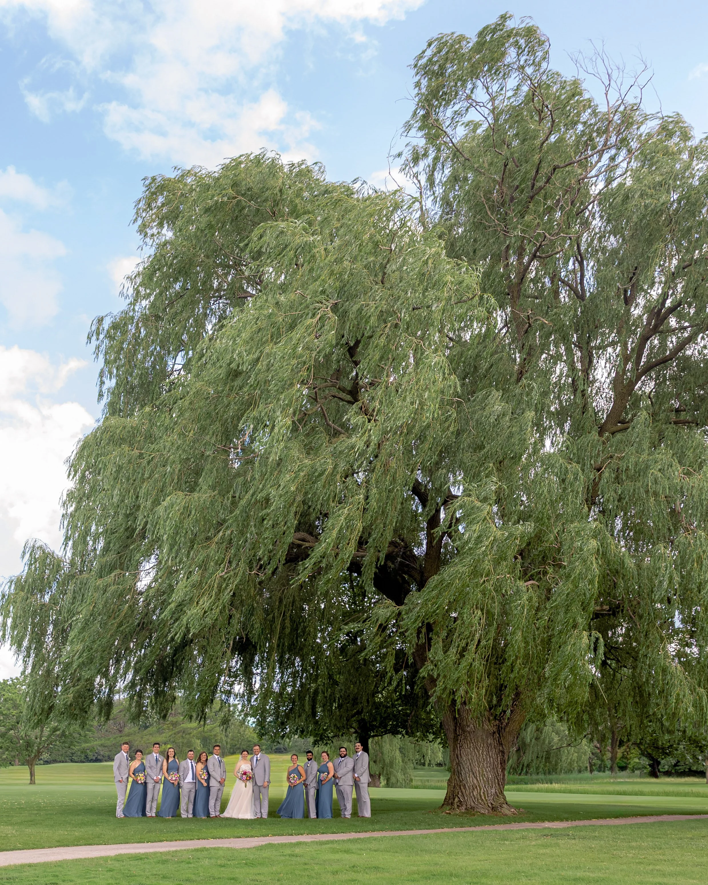 After family and wedding party portraits, everyone headed north to the River Club of Mequon. The golf course setting opened everything up—wide open afternoon light and the most beautiful willow tree right on the course. We had so much fun with portraits out there.