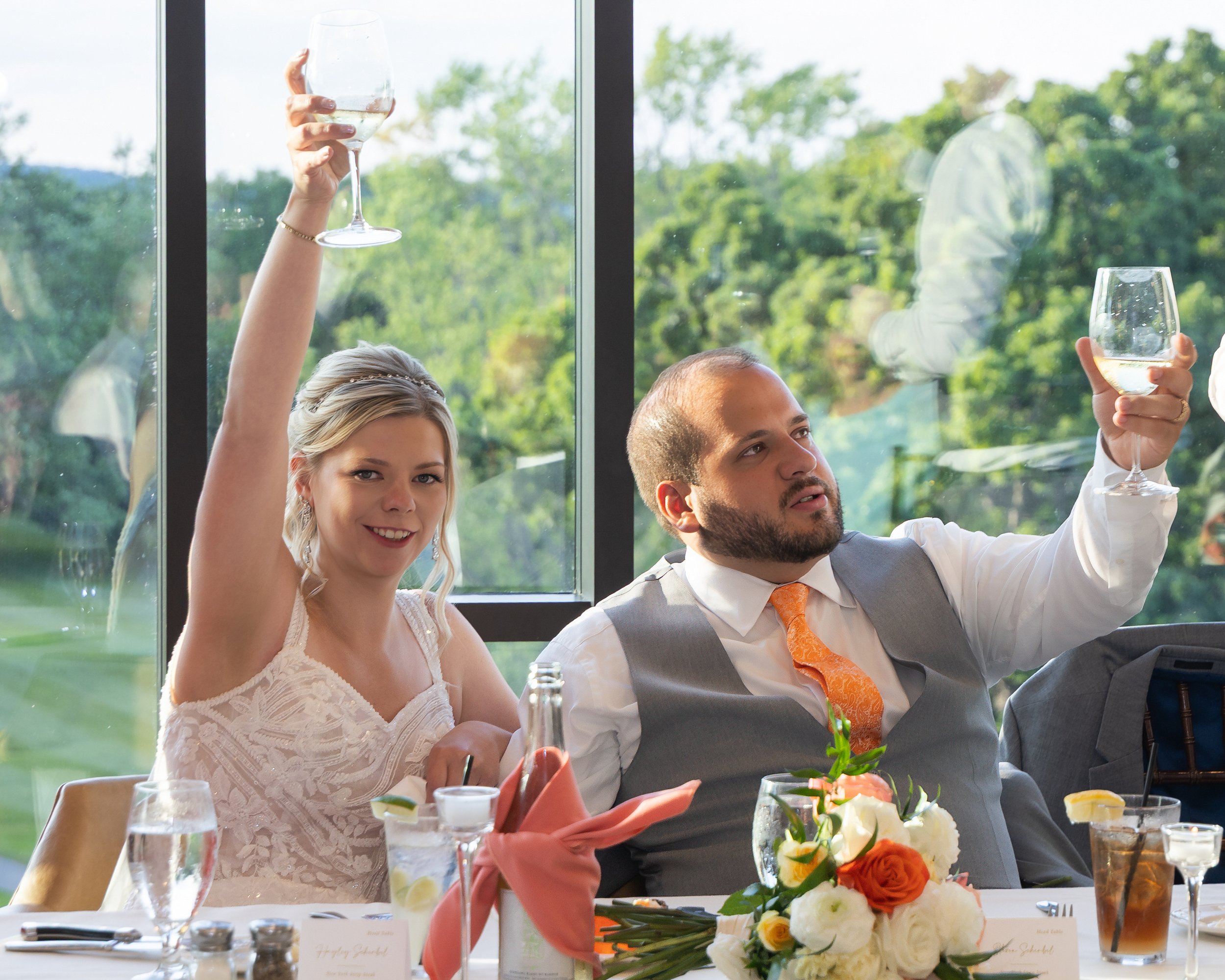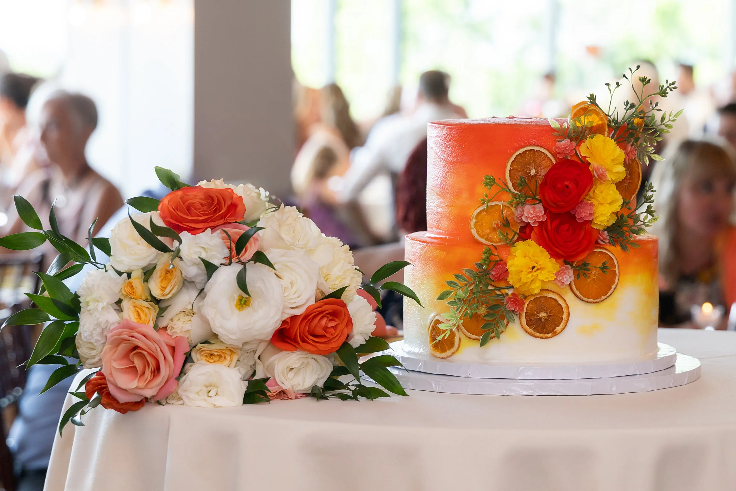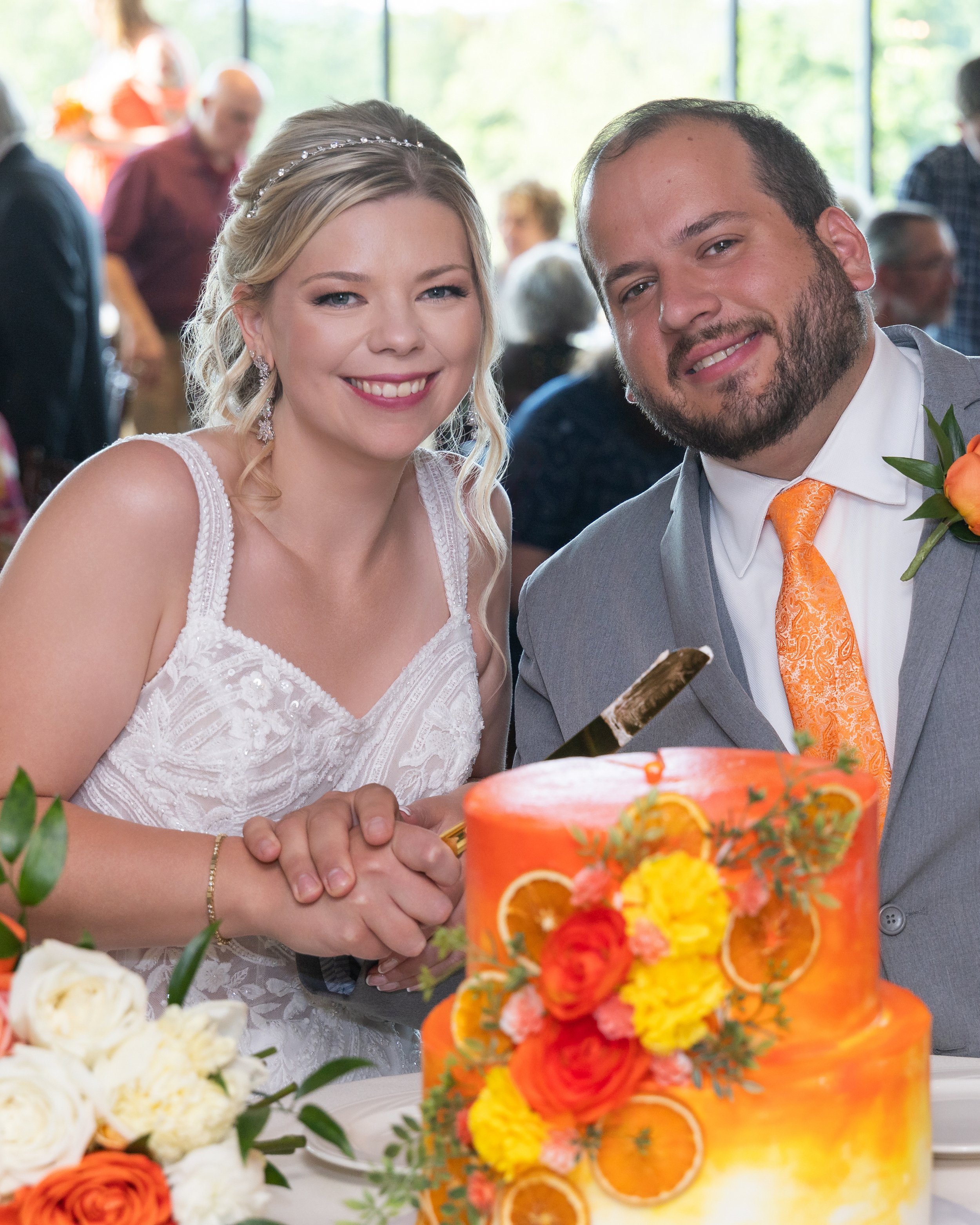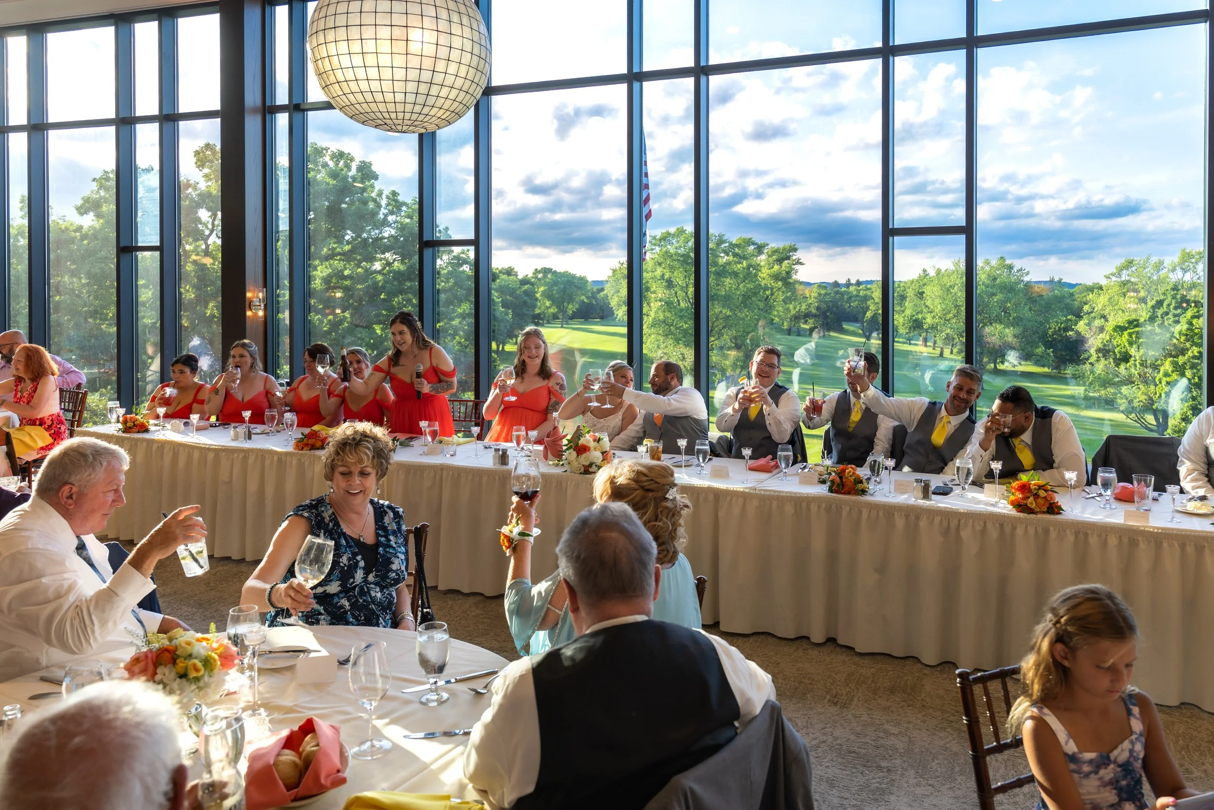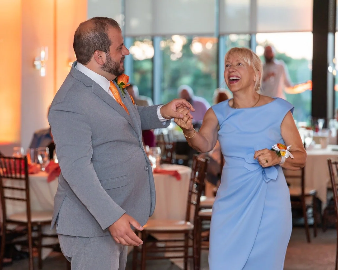 Big family, multiple generations, and a dance floor that filled up fast. The citrus colors carried right into the reception space and the room just felt alive all night. Dinner, toasts, dancing—so much fun.