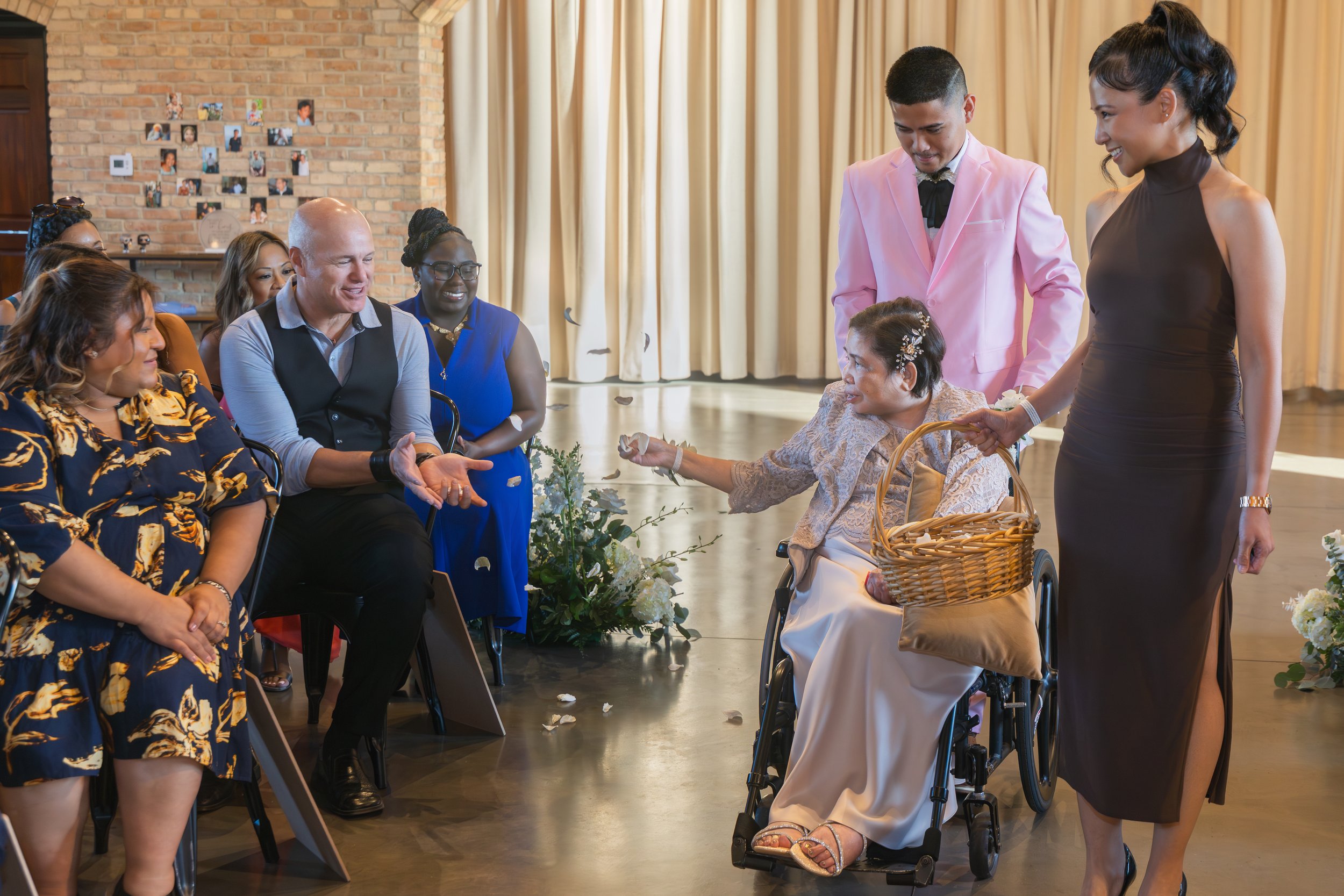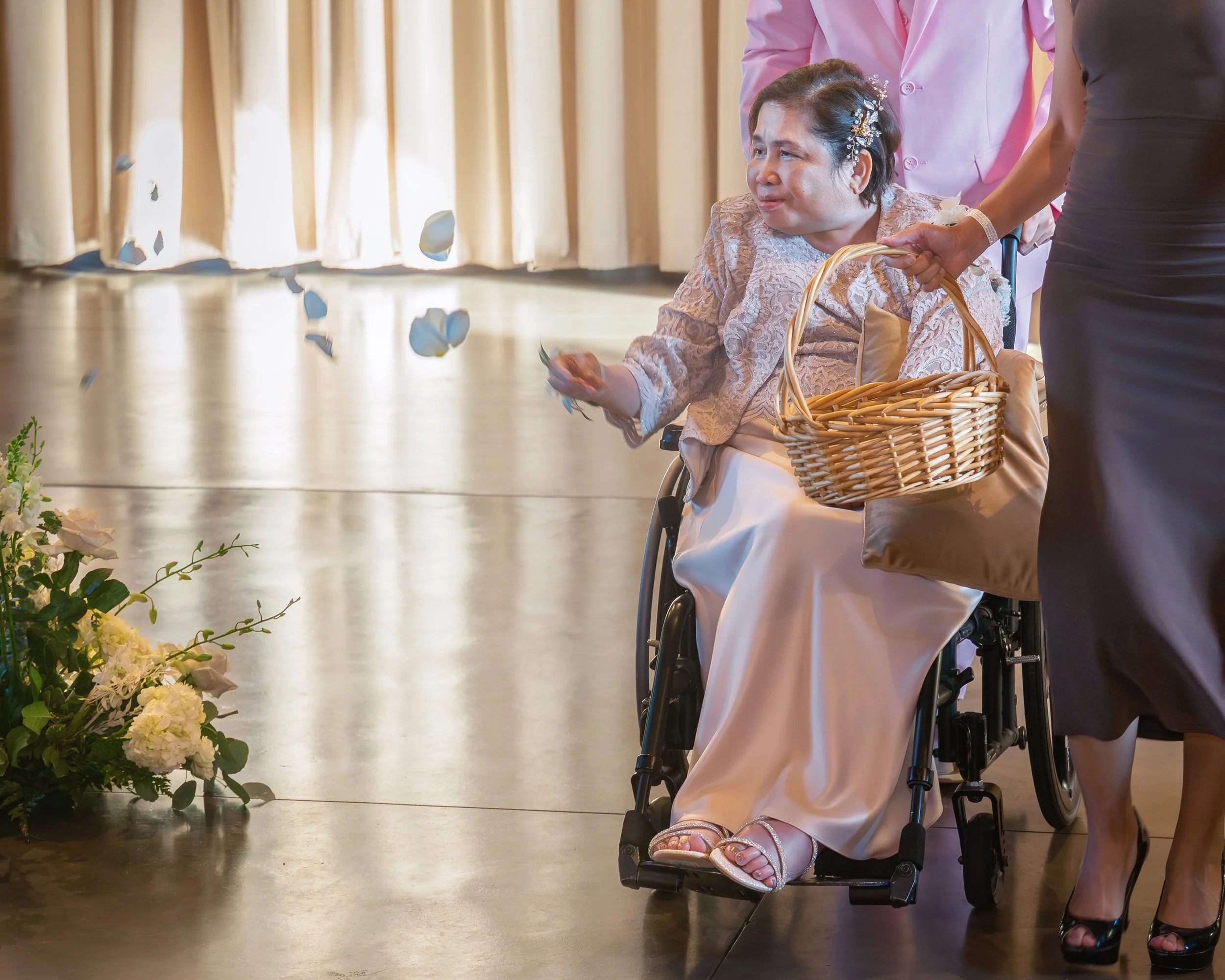 And then came the moment that stopped everyone: Mylene's mom, in a wheelchair, was escorted down the aisle by Mylene's sister as the flower girl.