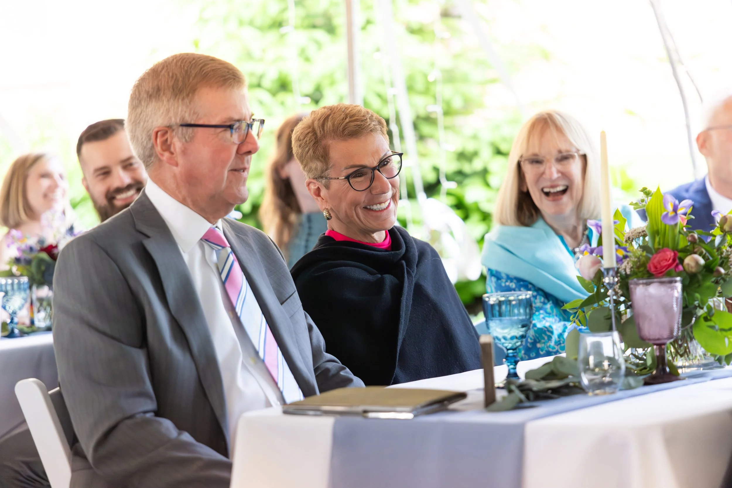 It was a perfect early summer day for being outside and chatting with friends and family. They had cocktails on a veranda followed by dinner and speeches in the tent.